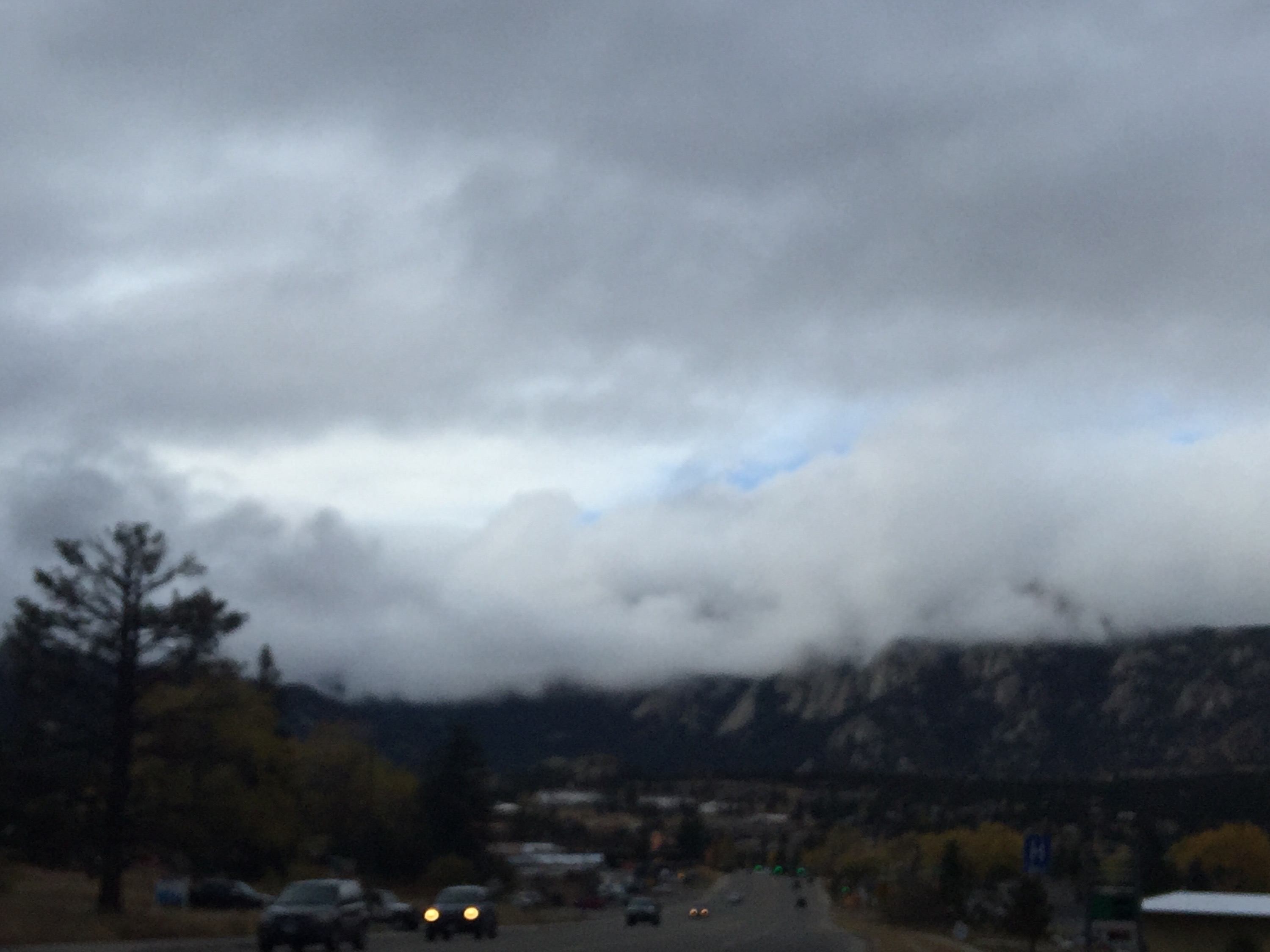 A slip of blue sky comes through