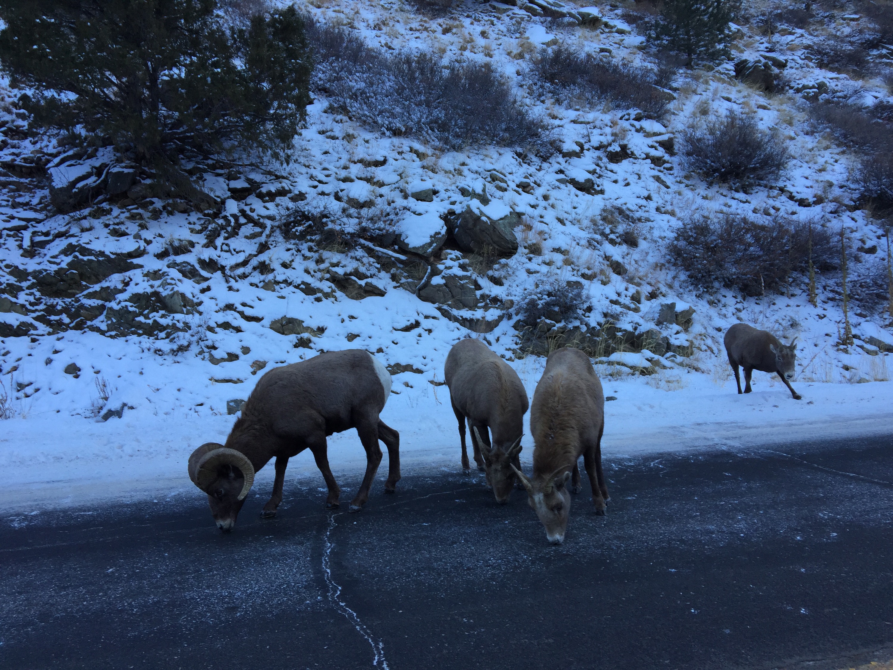 Driving to the VA Clinic in Fort Collins we saw these Rocky Mountain Bighorn Sheep licking the salt off of the road!