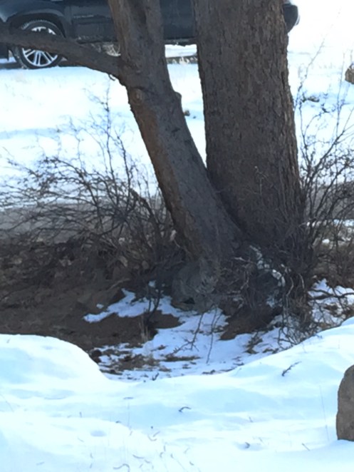 Then tonight as we decorated the church for Advent & Christmas (Hanging of the Greens), we saw this Bobcat (sitting in front of the left side of the tree) about ten yards from the fellowship hall side door!