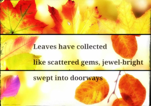 Autumnal drifts begin to collect, most of them made wetly dark and drab, mushy and sad where I live. But those that come from areas where maple trees and other startling, vivid-leaved beauties grow, when lit by sun’s rays, glow jewel-bright, entrancing the eye.