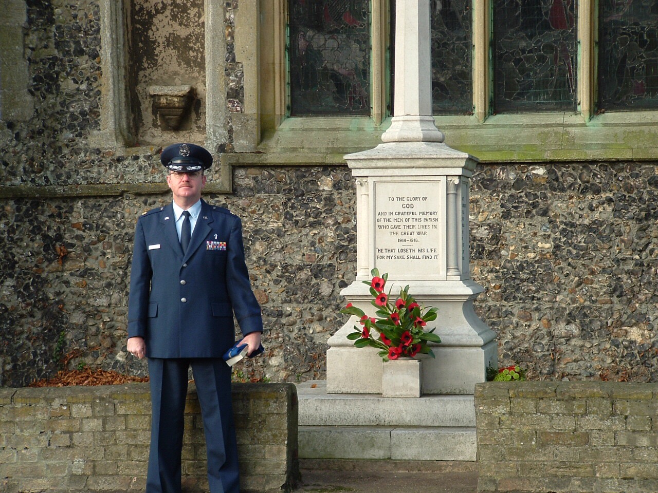 As we continue to move my folks from the Independent Living Condo to Assisted Living, I find myself going down memory lane. A year ago, we helped wrap up the move from the house I grew up in to the Condo. This picture was hanging in the Condo. I took it down today to bring it to the new apartment on what Americans call Veteran’s Day and our British friends call Remembrance Day. Today was Remembrance Sunday and the last time I helped to commemorate this somber day of reflection was in 2005. As the Wing Chaplain at RAF Mildenhall, home of the 100th Air Refueling Wing (our heritage traces back to the WW2 100th Bomb Group who flew B-17’s out of RAF Thorpe Abbot near Dickleburg where this ceremony in 2005 took place), I took part in the ceremony. I remember laying the wreath in memory of the US Army Air Forces members who lost their lives in WW2 and praying for the dead and the living from all wars.