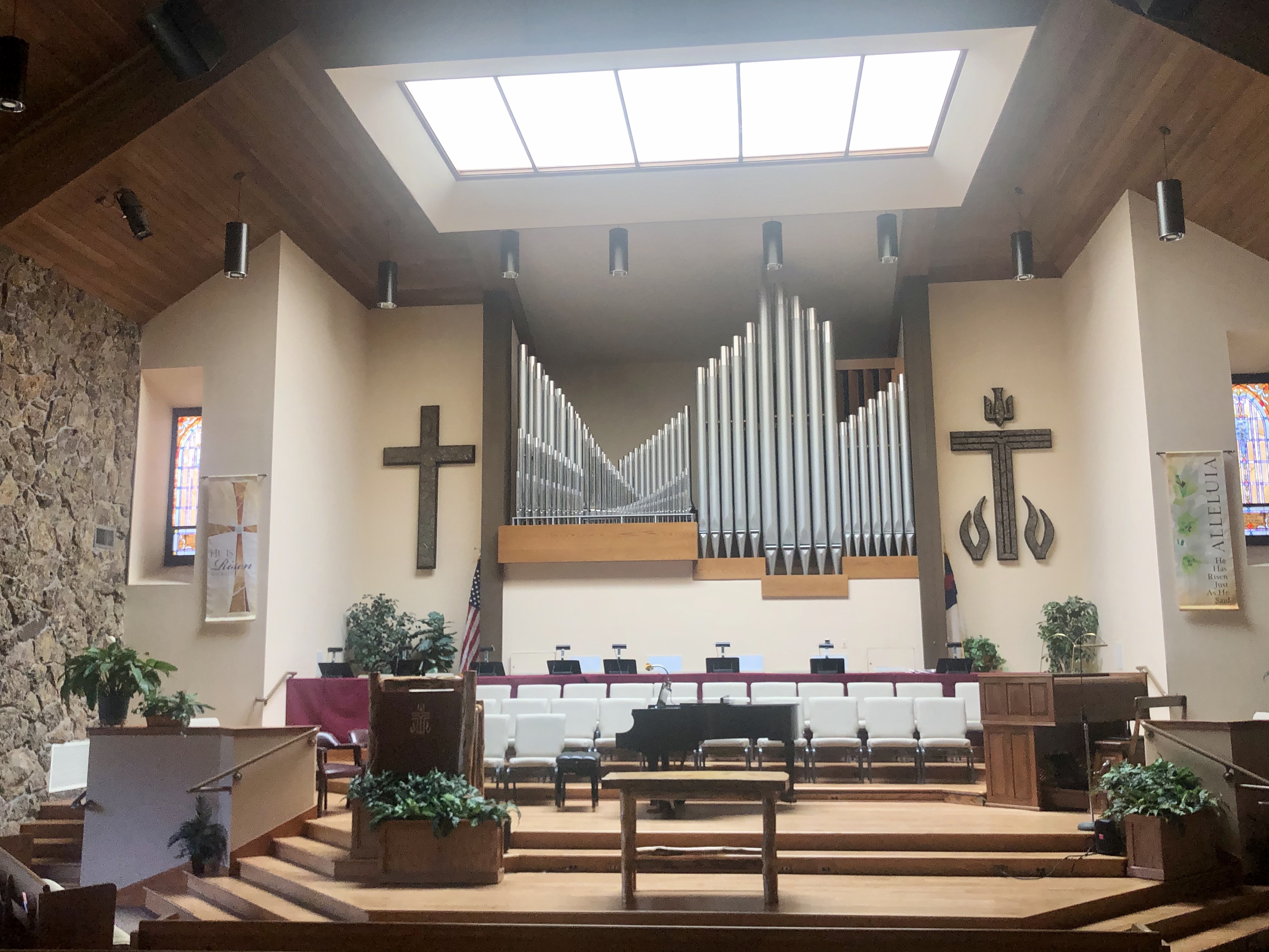 The Easter banners remind us that Christ has risen, he has risen indeed! The sanctuary is empty. The tomb was empty. He has risen! This season has taught us many things. Fellowship and caring go on in different ways. But they are still happening. Worship is going on in a new way but it is still the community of faith gathering together.